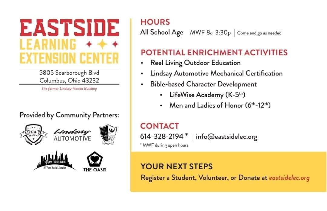 The Eastside LEC was a vision initially presented by a member of the school Board after the Public schools were forced to go to virtual online classrooms because of the COVID-19 Pandemic. The Board member reached out to Nonprofits and Churches to host learning extension centers in their facilities with Wifi capabilities and social distance learning for the online child's learning convenience during the closing of the schools during this pandemic.